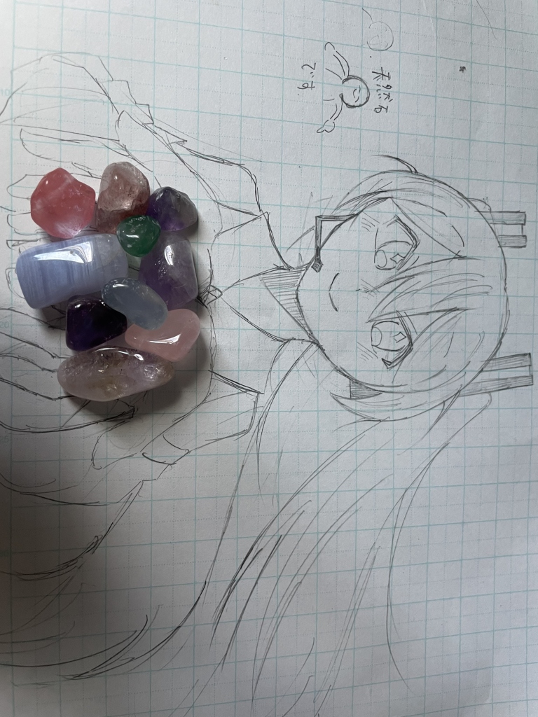 画材と一緒の写真はよく見ますが、これはグッドアイデアですね~リアル天然石を差し出すミクちゃん絵素敵です。